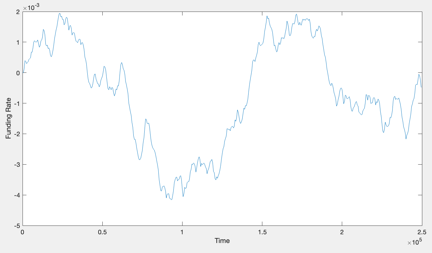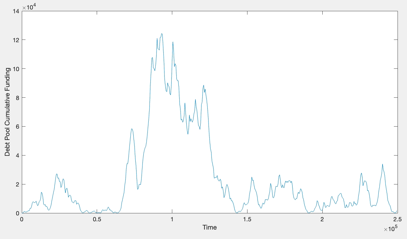 This model represents a mathematically minor adjustment to the current system, but with significant implications to the overall mechanism. Put simply, instead of r = c * skew, instead we have dr/dt = c * skew. In practice, the effect of this change is that funding rates will continuously drift higher/lower in the presence of uncorrected position imbalances, creating a natural price discovery mechanism for funding rates while simultaneously smoothing out funding rate trajectories. Another notable change is that with this mechanism, LPs would no longer exclusively earn funding (e.g. short skew + positive funding, LPs pay funding). Instead, funding flows through LPs without gain or loss over time (i.e. can be mathematically shown that net funding earned by LPs over time is zero). See plots below illustrating debt pool earning funding when dr/dt > 0 while paying equal and opposite funding when dr/dt < 0